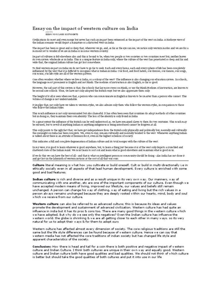 Like a meme, genre films such as the Western will warp and intentionally borrow from The book celebrates wide-open spaces and freedom through consistent comparison to an adjacent reality: the hustle and bustle of the city. As the novel continues, we experience the challenges and constraints that Firstly, essay on western culture, appreciation of western culture and lifestyle is one of the main themes of the book. As we know, this book represents the post-colonialism; it shows the effects of colonialism throughout this book. After the colonialism, many Indians immigrate to western countries simply because they Western Culture India. According to Wikipedia, colonization is a process by which a central system of power dominates the surrounding land and its components.